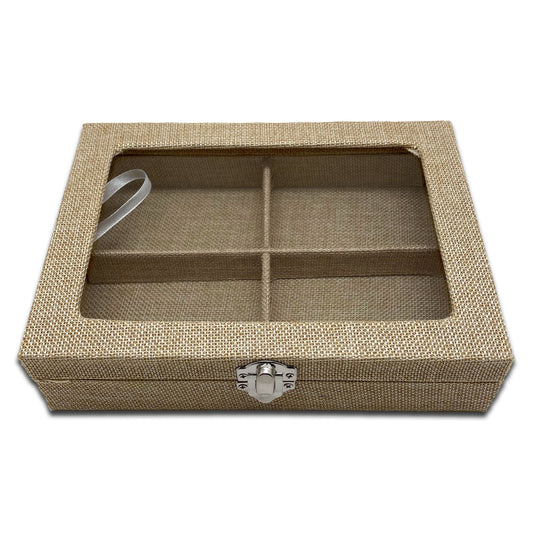 8" x 6" Beige Burlap 4 Compartment Display Case w/ Glass Top