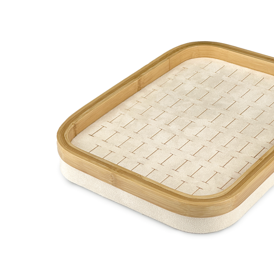 11" x 8" Bamboo Rim Beige Suede 76 Ring Display Tray