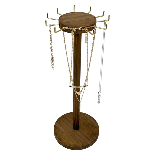 15 3/4" Walnut Wood Round Necklace Display Stand with 11 Gold Hooks
