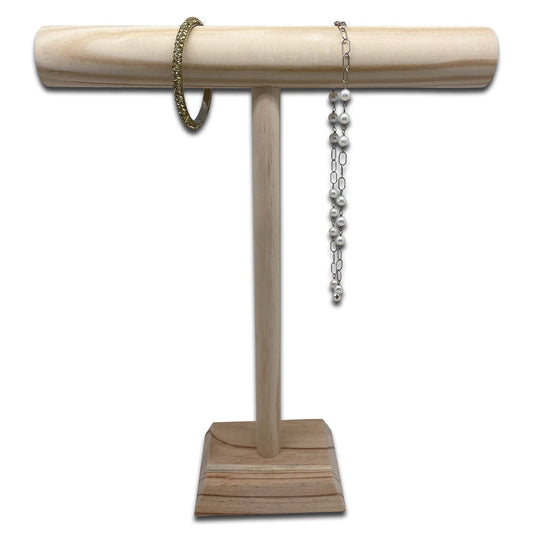 T-bar jewelry displays allow you to showcase multiple levels of jewelry. Like our jewelry busts, t-bar jewelry displays come in three colors and materials; black velvet, white leather and beige burlap. Tall bar displays are used to showcase necklaces whereas the smaller bar displays are used for bracelets. Tall displays can hold several necklaces at once and are great for comparing length and thickness. Shorter multi-bar jewelry displays are perfect for bracelets and watches. We carry single, double and triple level t-bar displays.
