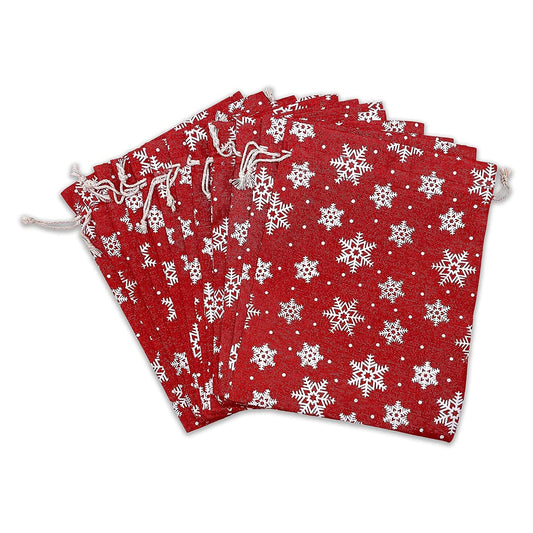 6" x 8" Jute Burlap Red Christmas White Snowflake Drawstring Gift Bags