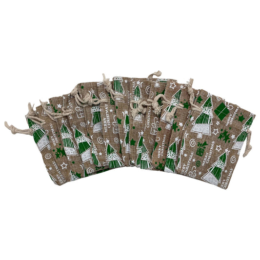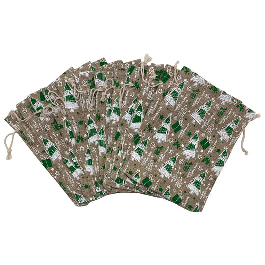 6" x 8" Jute Burlap Green Christmas Tree Drawstring Gift Bags