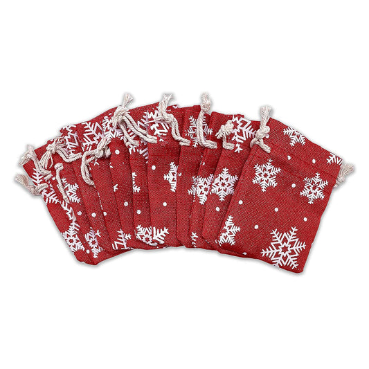3" x 4" Jute Burlap Red Christmas White Snowflake Drawstring Gift Bags