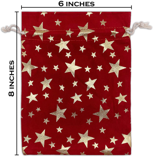 8" x 10" Red Velvet Gold Star Christmas Drawstring Gift Bags