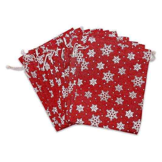 8" x 10" Jute Burlap Red Christmas White Snowflake Drawstring Gift Bags