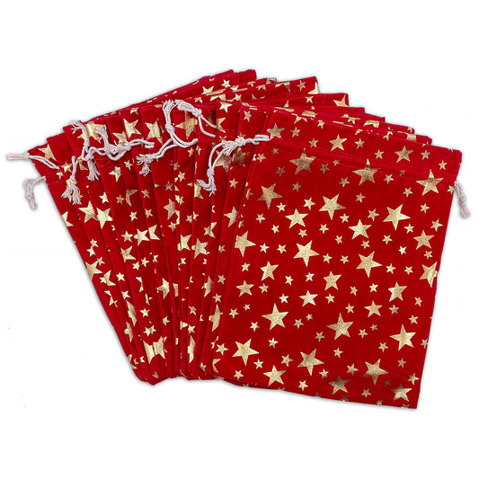 12" x 16" Red Velvet Gold Star Drawstring Gift Bags