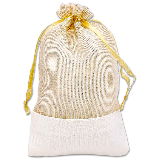 Gold Organza and White Linen Drawstring Pouch Gift Bags