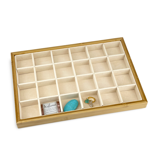 14" x 9 1/2" Wood and Suede 24 Compartment Jewelry Display Tray