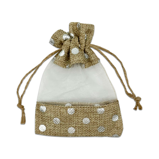 3 1/2" x 5 1/2" Beige with Silver Polka Dot Linen Burlap and Sheer Organza Gift Bag