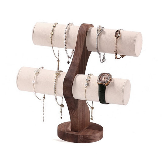 2 Tier Cream Microfiber Walnut Round Bar Bracelet Display