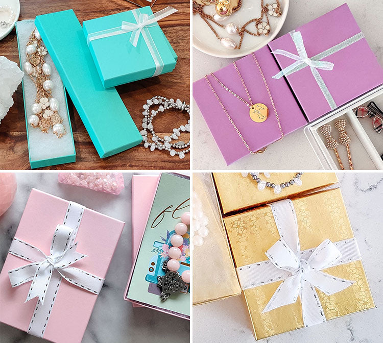 Cotton-filled boxes are available in black, blue, gold, gray, green, kraft, orange, pink, purple, red, silver, teal, yellow, rose gold and more. Visit our Shop by Color page to view all available colors.