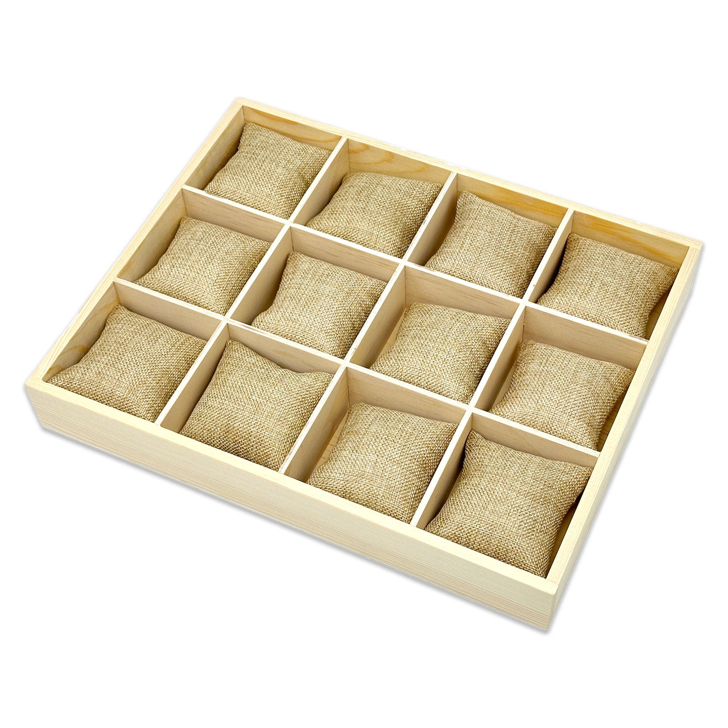 - Comes with 3" x 3" burlap pillows for bracelets, watches, or bangles.