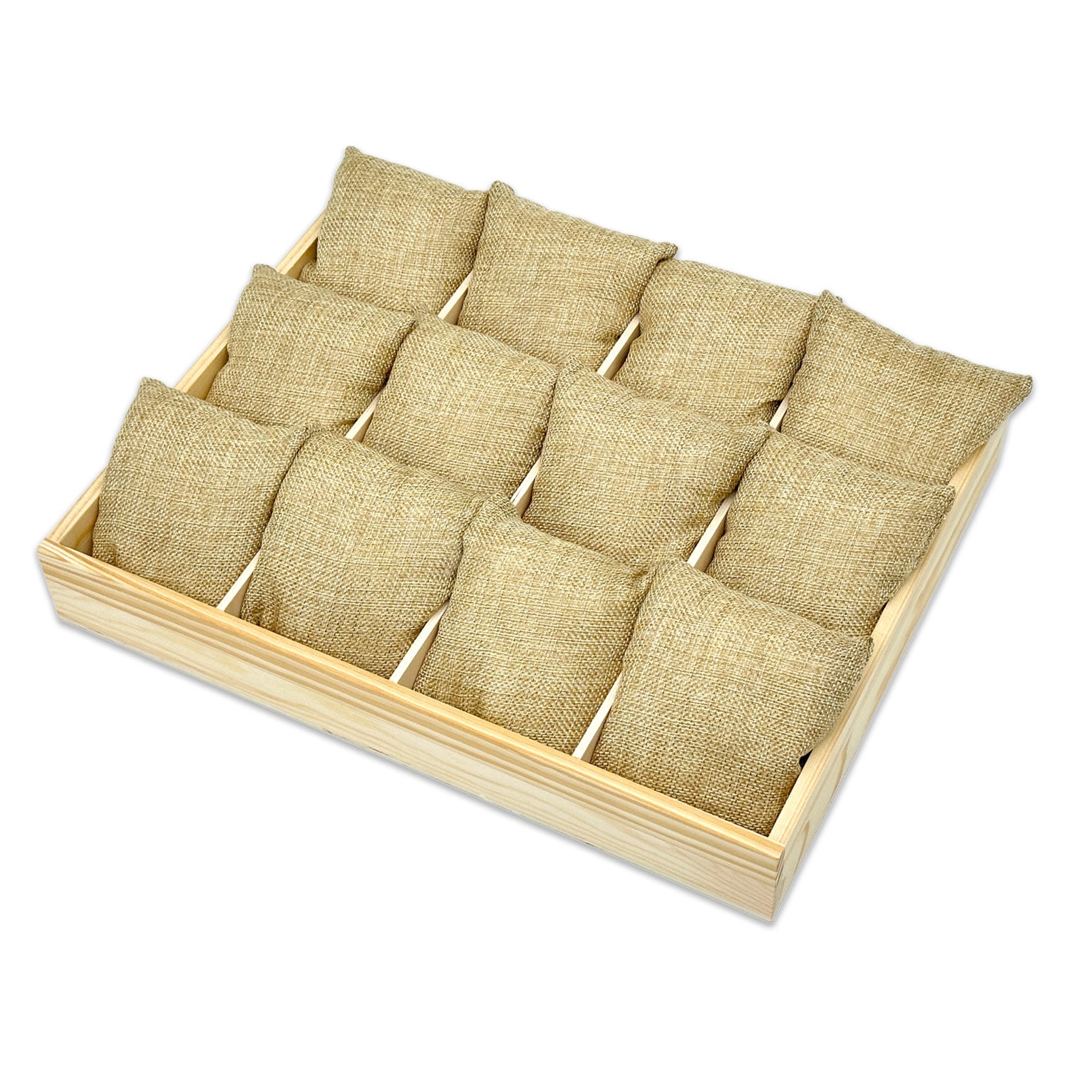 - Comes with 4" x 4" burlap pillows for bracelets, watches, or bangles.