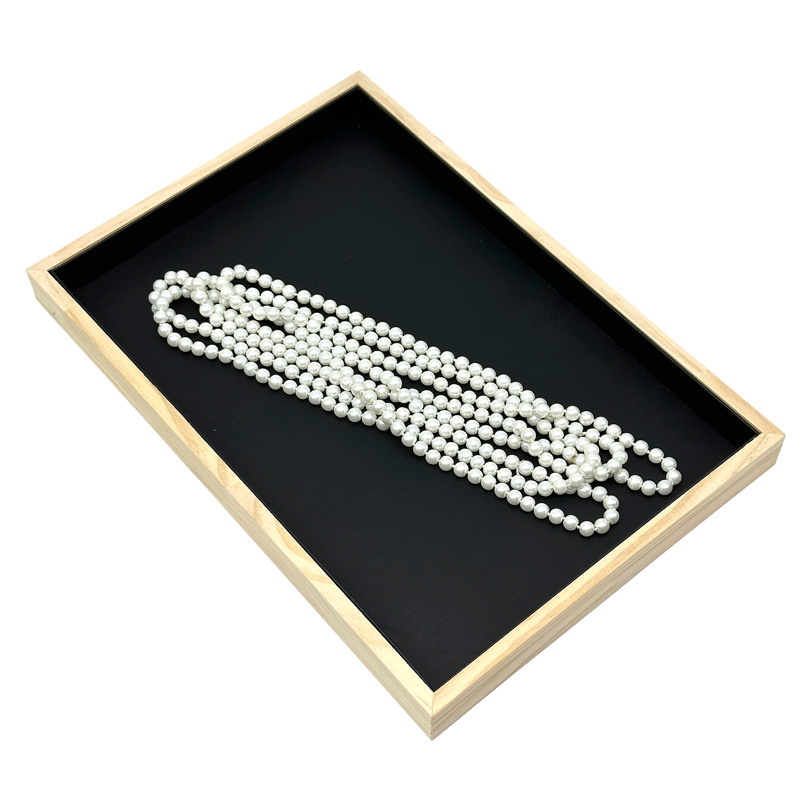 - A pine wood and black leatherette tray perfect for storing and displaying a wide variety of jewelry.