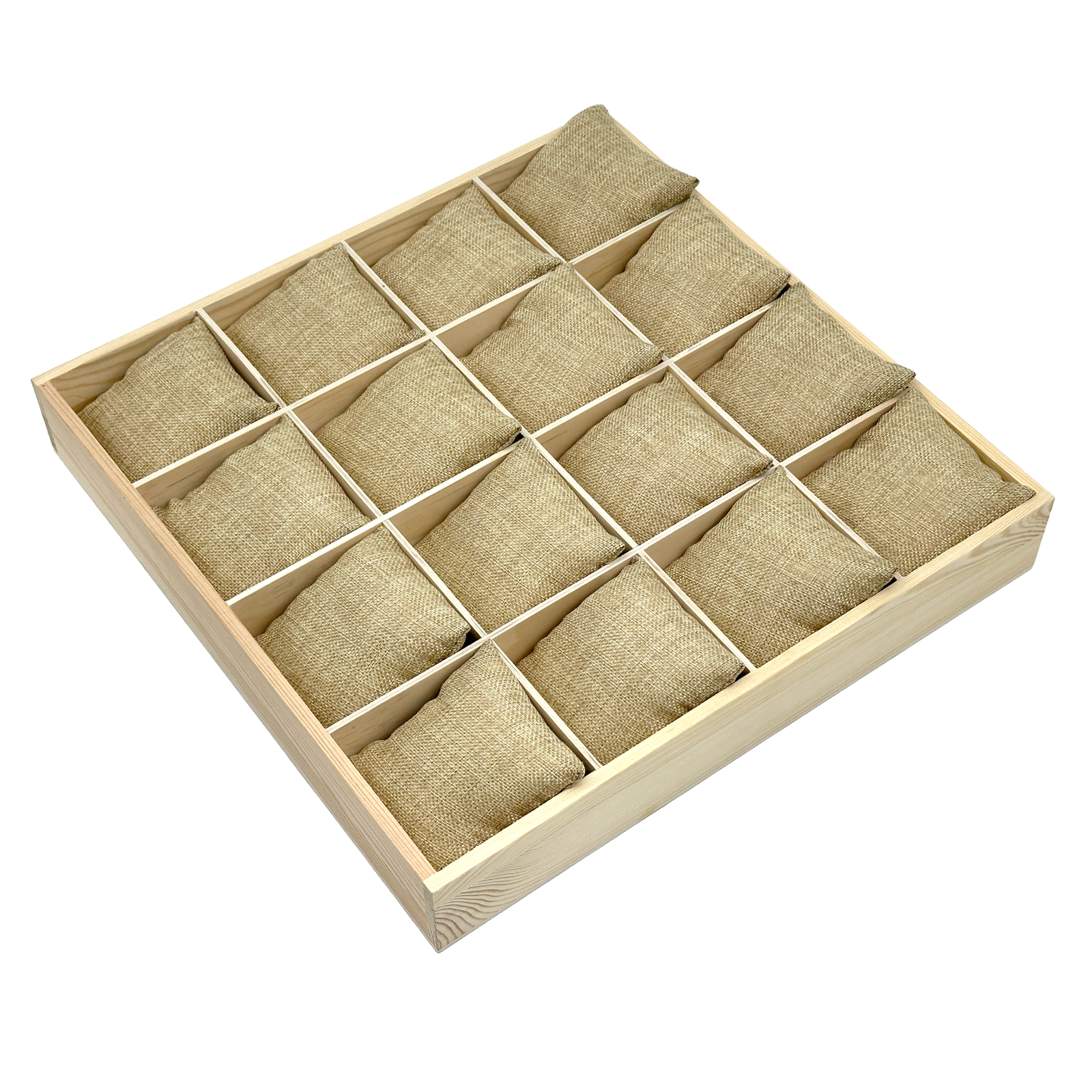 15 1/4" x 15 1/4" Natural Pine 16 Compartment Jewelry Tray with Burlap Pillows