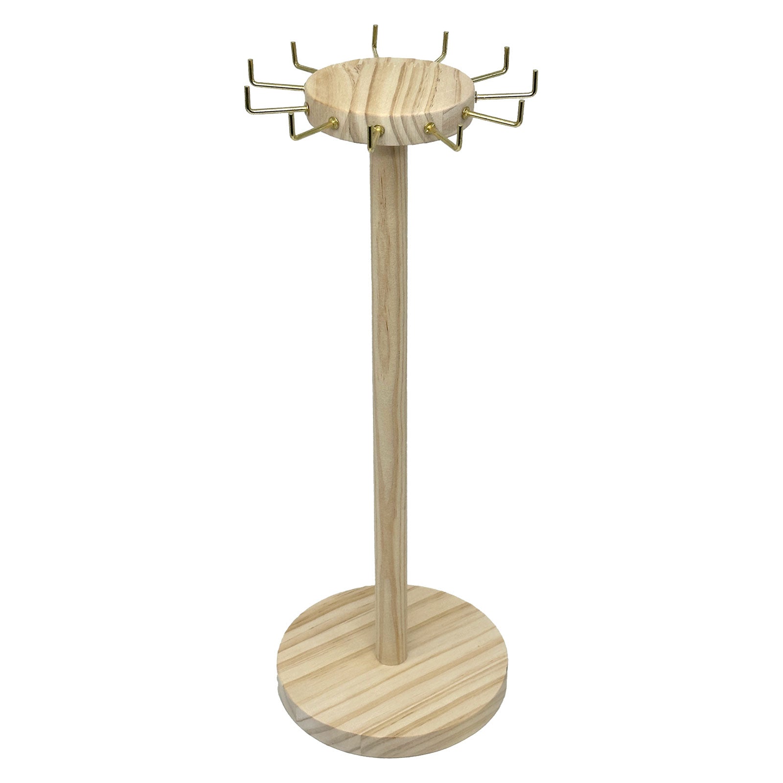 - A natural pine wood jewelry display stand with 11 gold-colored hooks for necklaces, chains, or dangle earrings.
