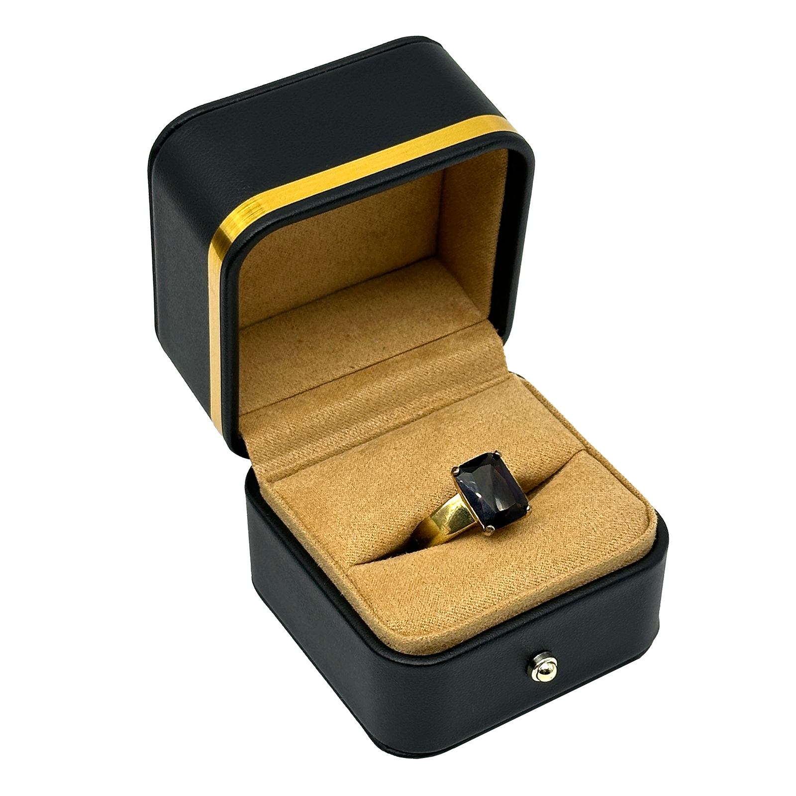 - A beautiful and elegant black leatherette ring box with gold trim and matching interior.