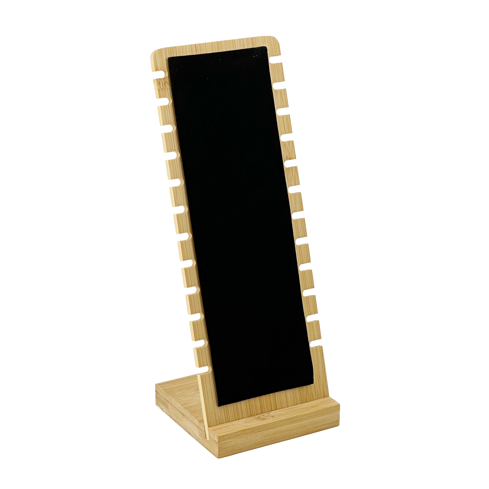 - A two-piece bamboo necklace display with velvet that can be used horizontally or vertically.