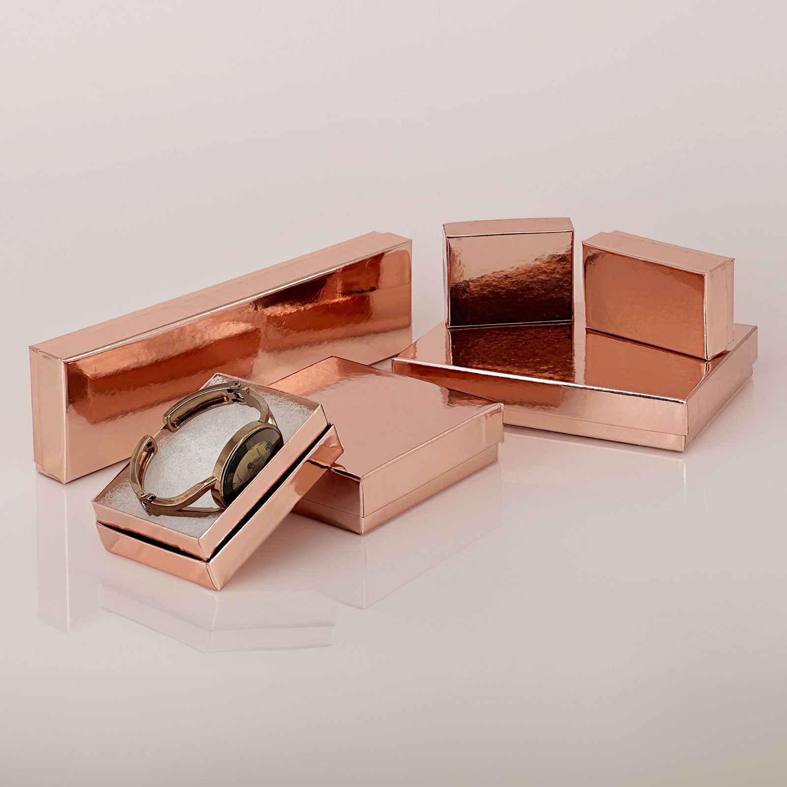 Cotton-filled boxes are available in black, blue, gold, gray, green, kraft, orange, pink, purple, red, silver, teal, yellow, rose gold and more. Visit our Shop by Color page to view all available colors.