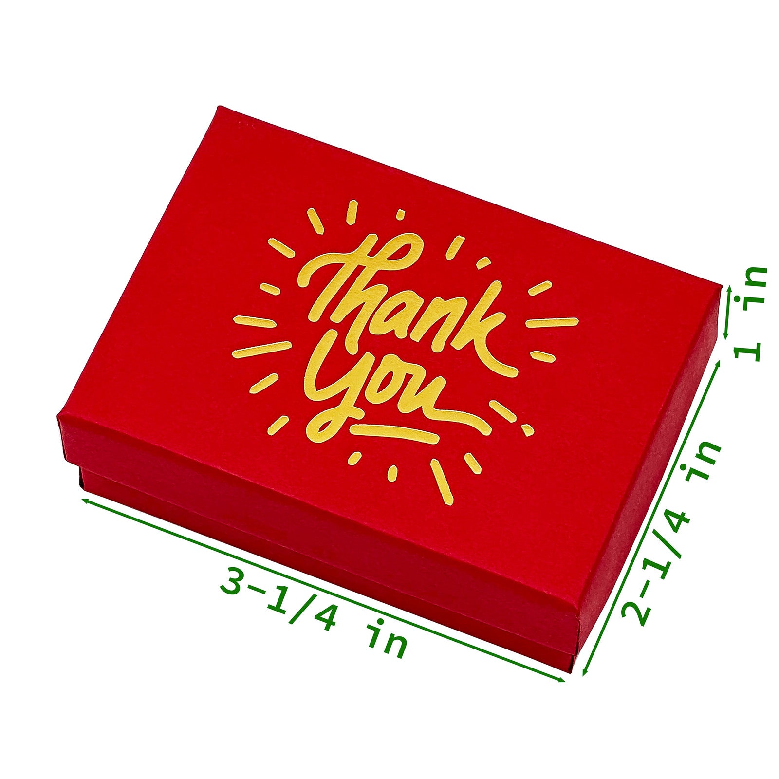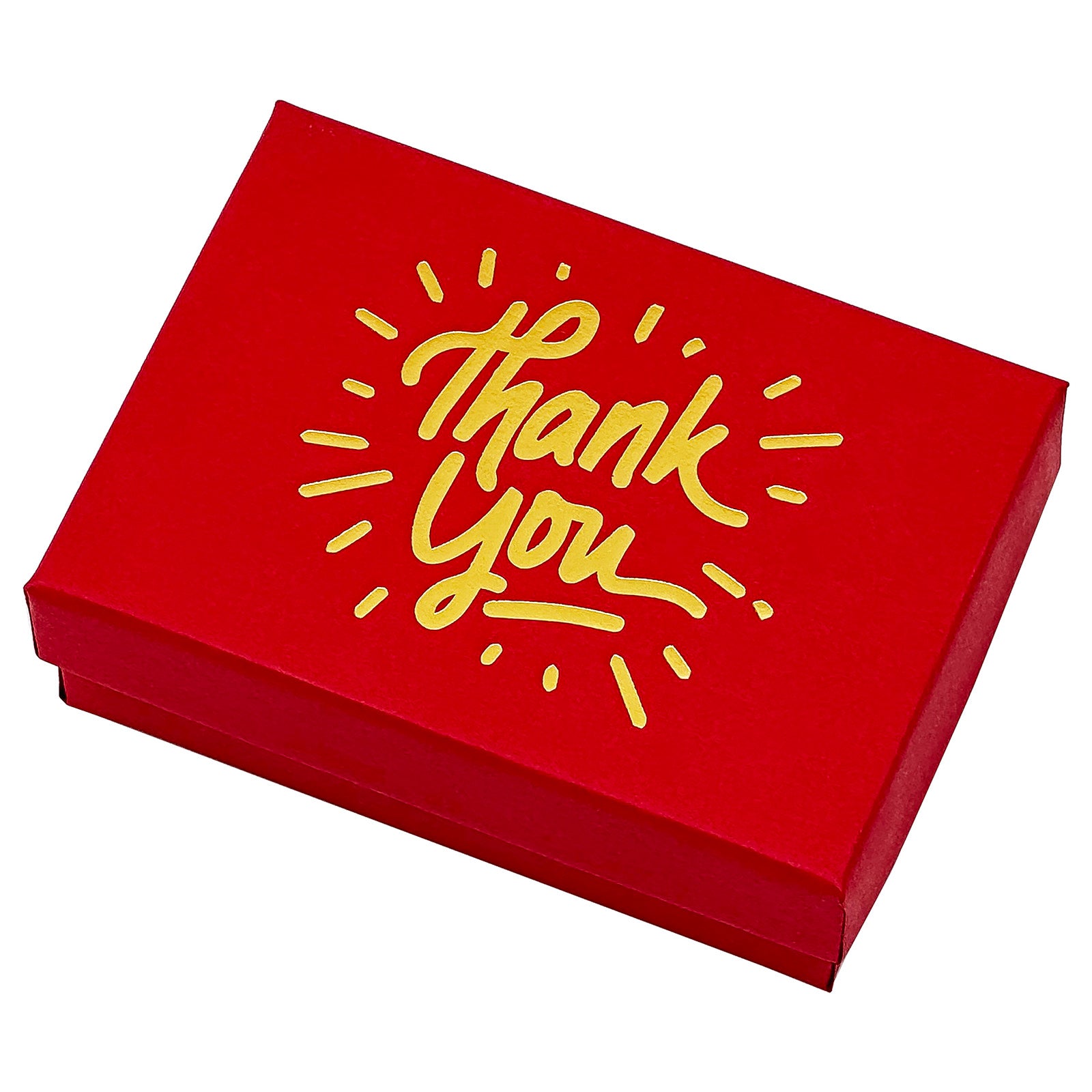 - A matte red cotton-filled box with a gold foil "Thank You" print.