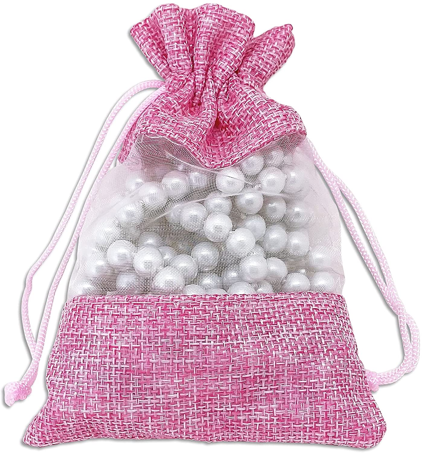 3 1/2" x 5 1/2" Linen Burlap and Sheer Organza Pink Gift Bag