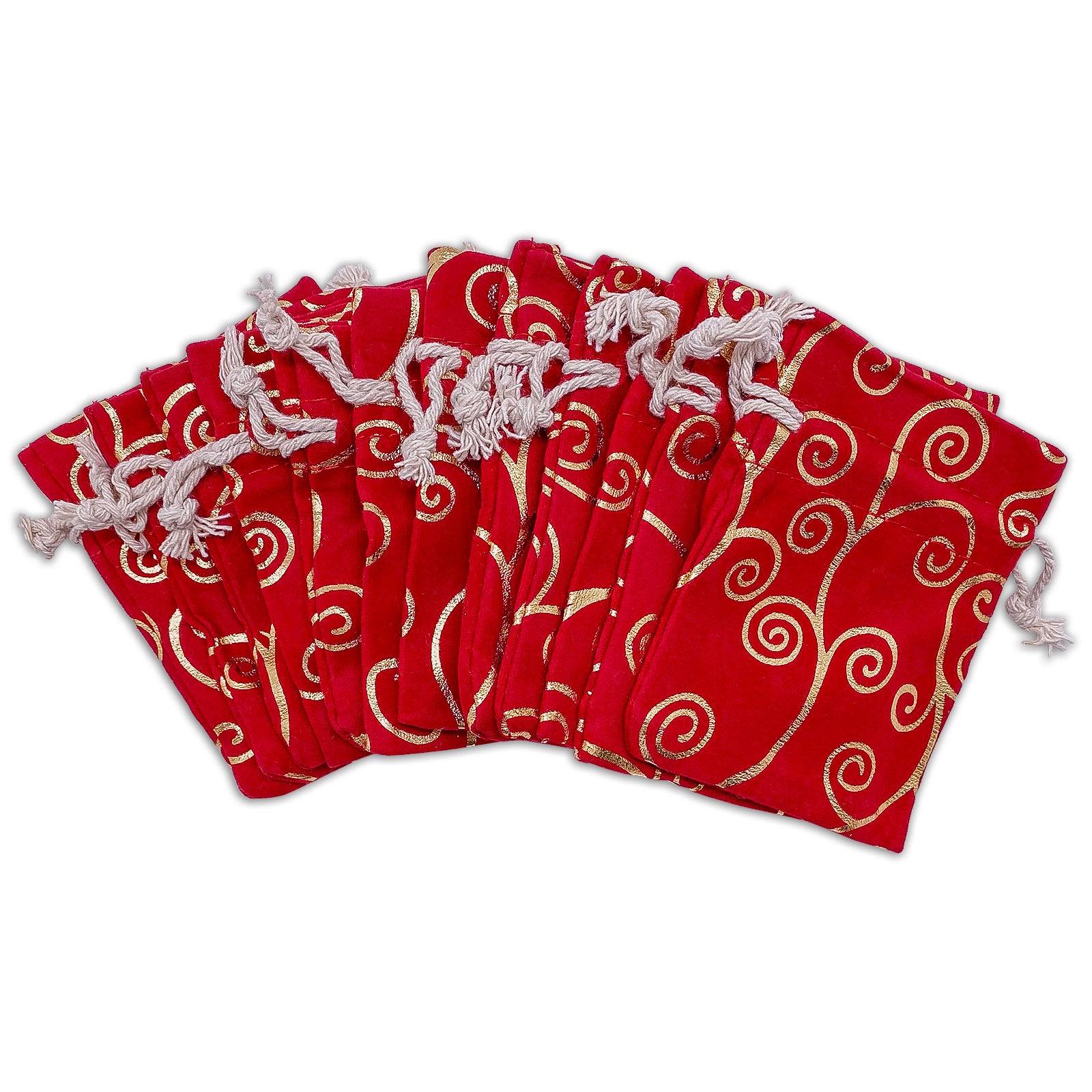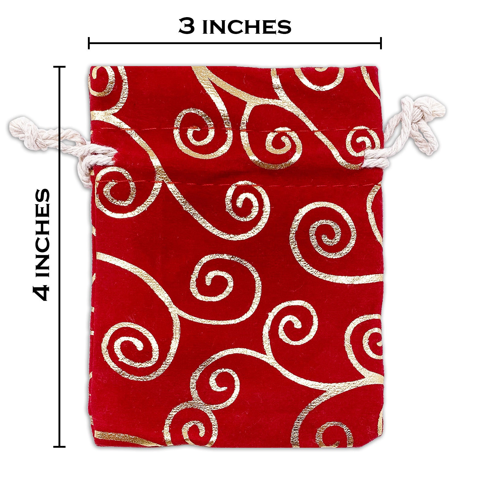 3" x 4" Red Velvet Gold Swirl Christmas Drawstring Gift Bags
