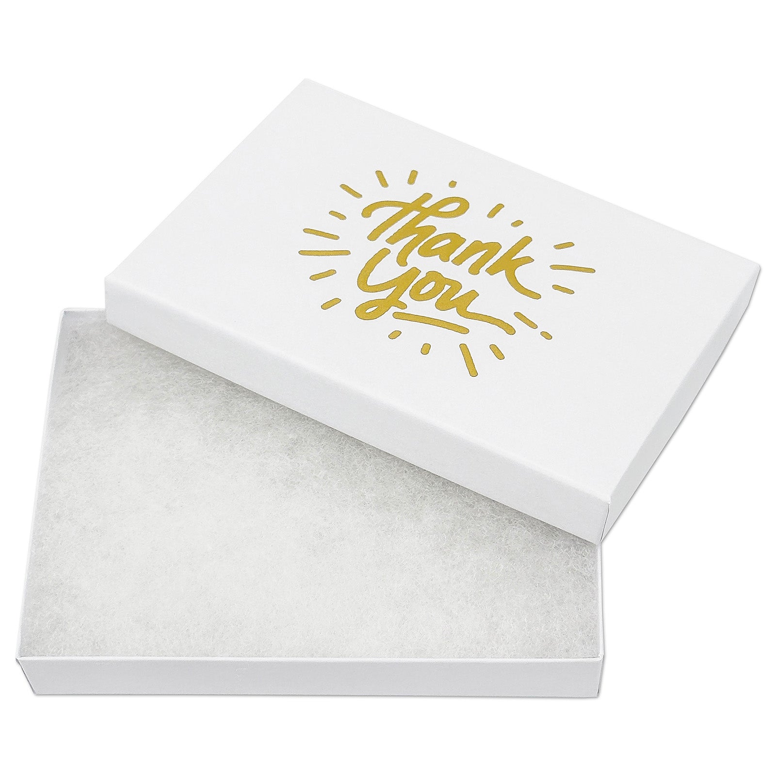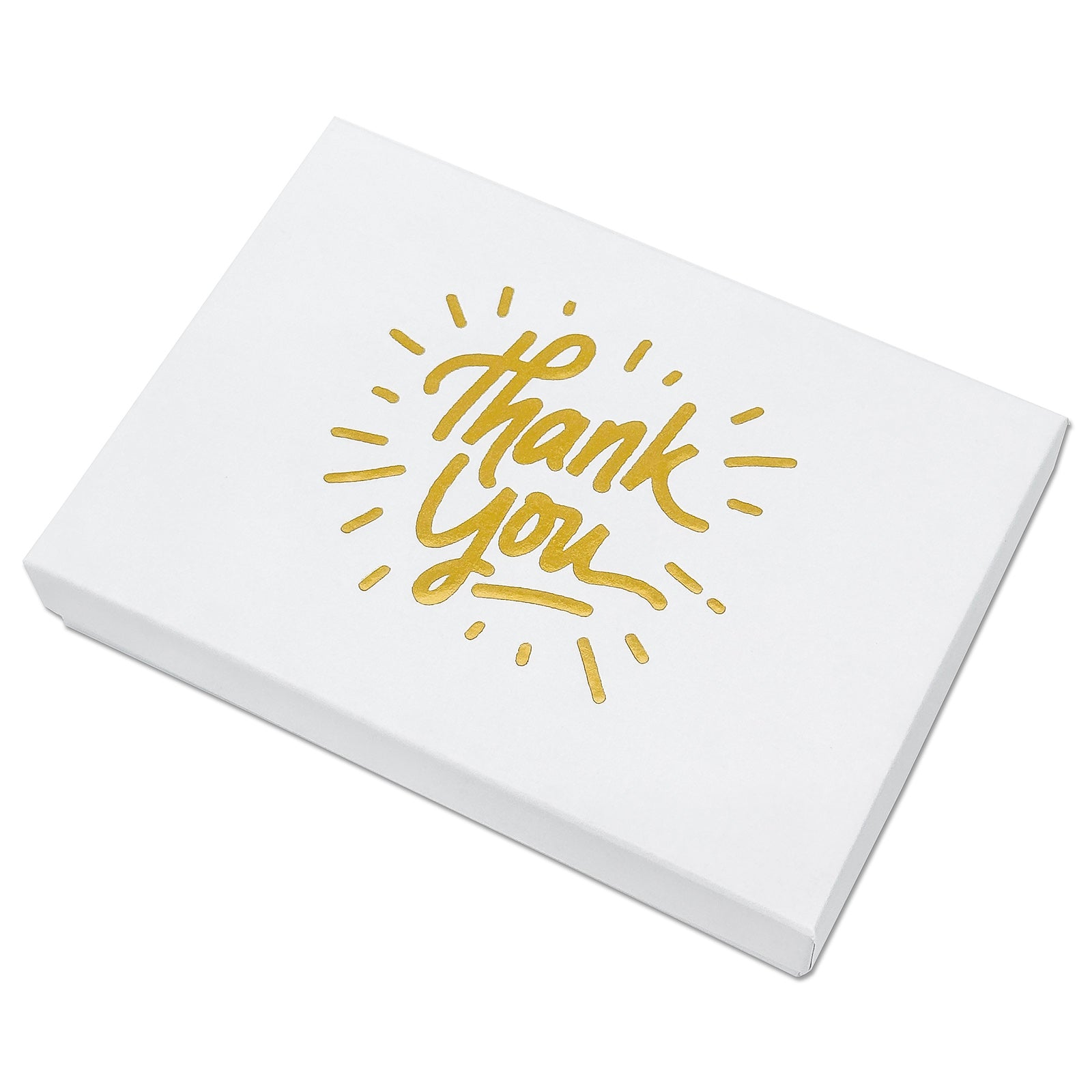 - A matte white cotton filled box with gold "Thank You" print.