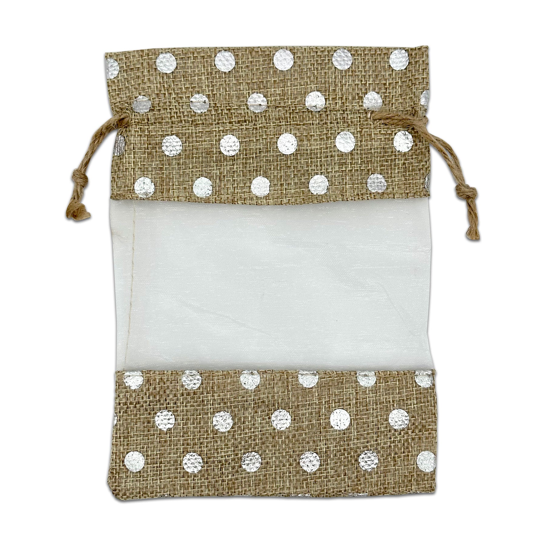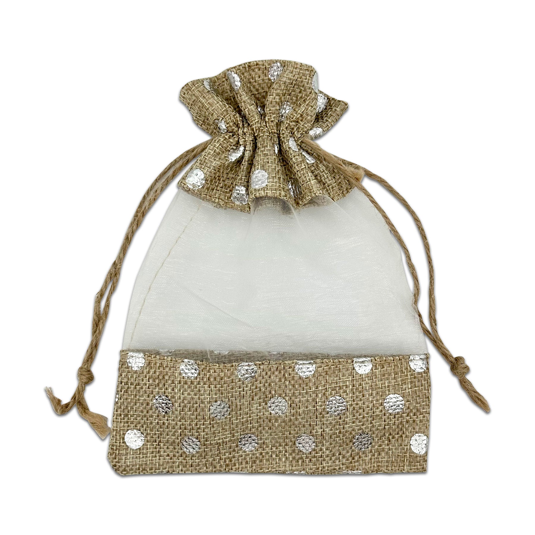 5" x 7" Beige with Silver Polka Dot Linen Burlap and Sheer Organza Gift Bag