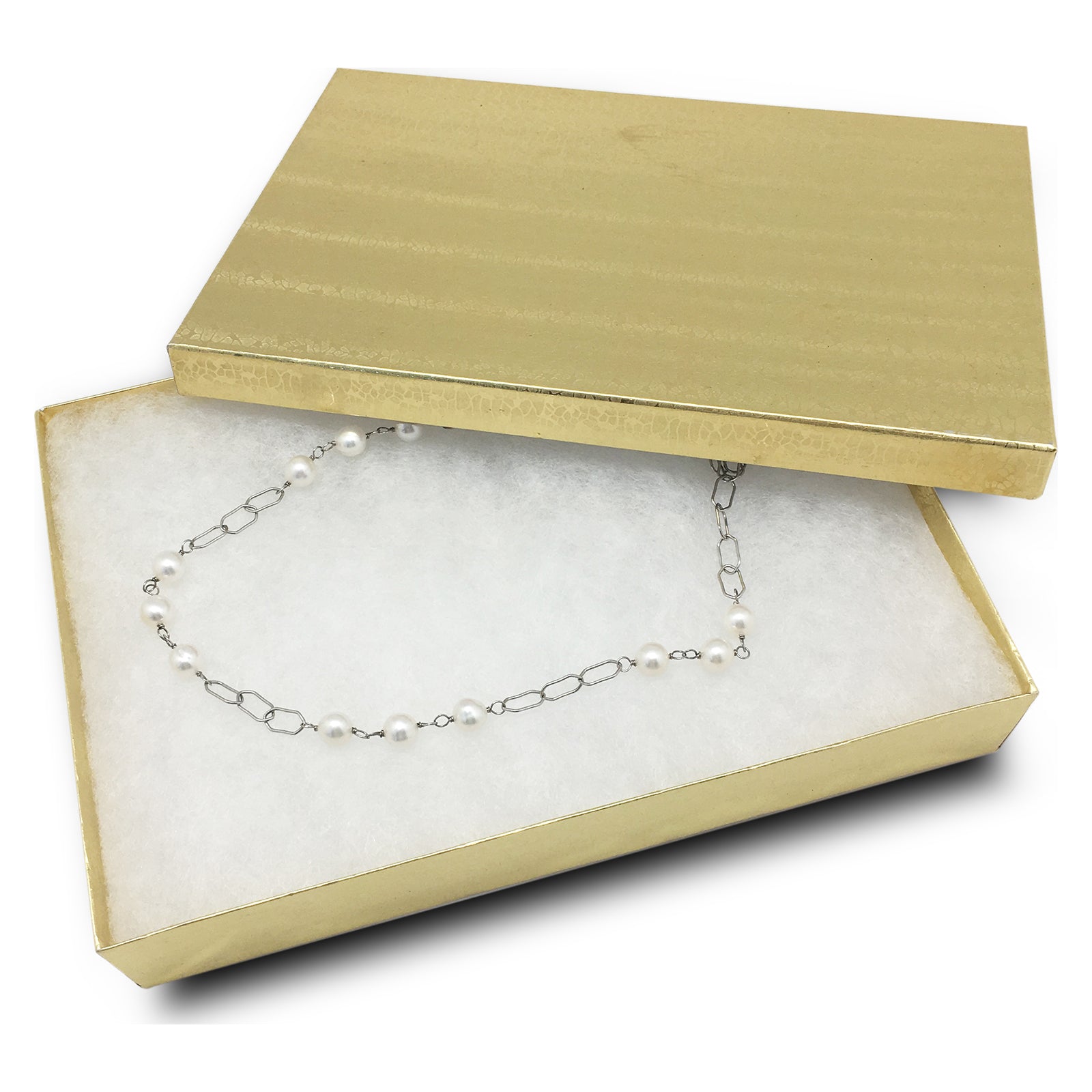 The gold foil boxes are nice and come in various sizes. However, the one drawback I have found is that the thickness of the fiber (and it is NOT real cotton) is not consistent. One box base may have the entire base filling full from the bottom to the top edge of the botton base, whereas another box may have only a quarter of the filling in that same space. It's a quality control problem from a very large country in Asia (I know because the boxes inside the external shipping box say from P.R.C.) The prices keep going up and, for the time being, I can still afford them. They look good when selling my earrings at craft shows.