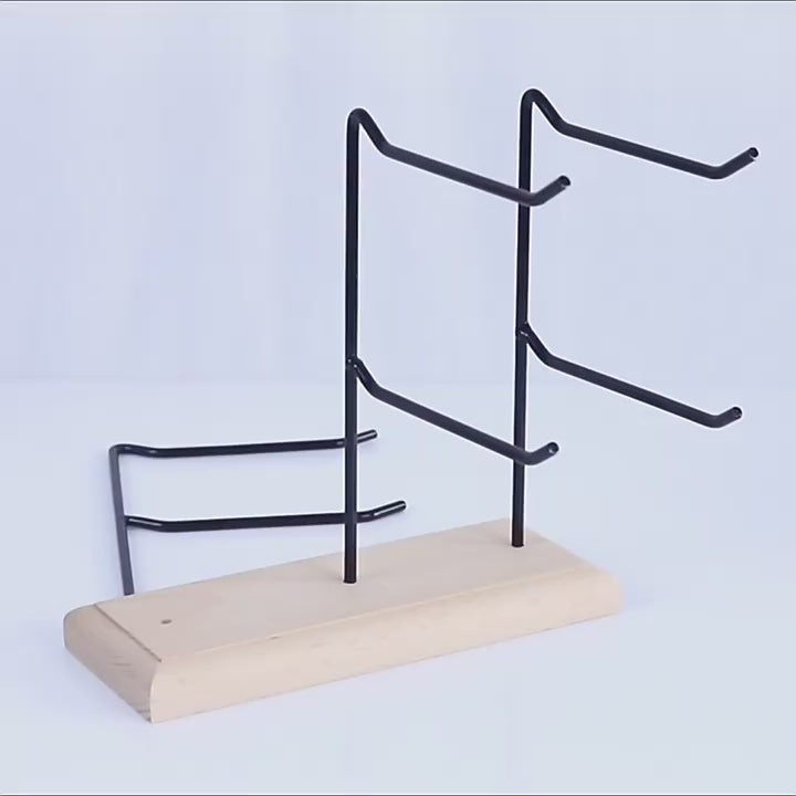 - A modern earring stand with 6 metal hooks in two tiers and a wide pine wood base.