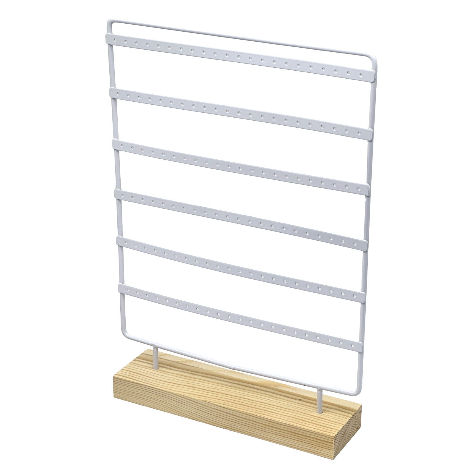 - A simple yet elegant earring stand with 6 white metal tiers and a wide wood base.