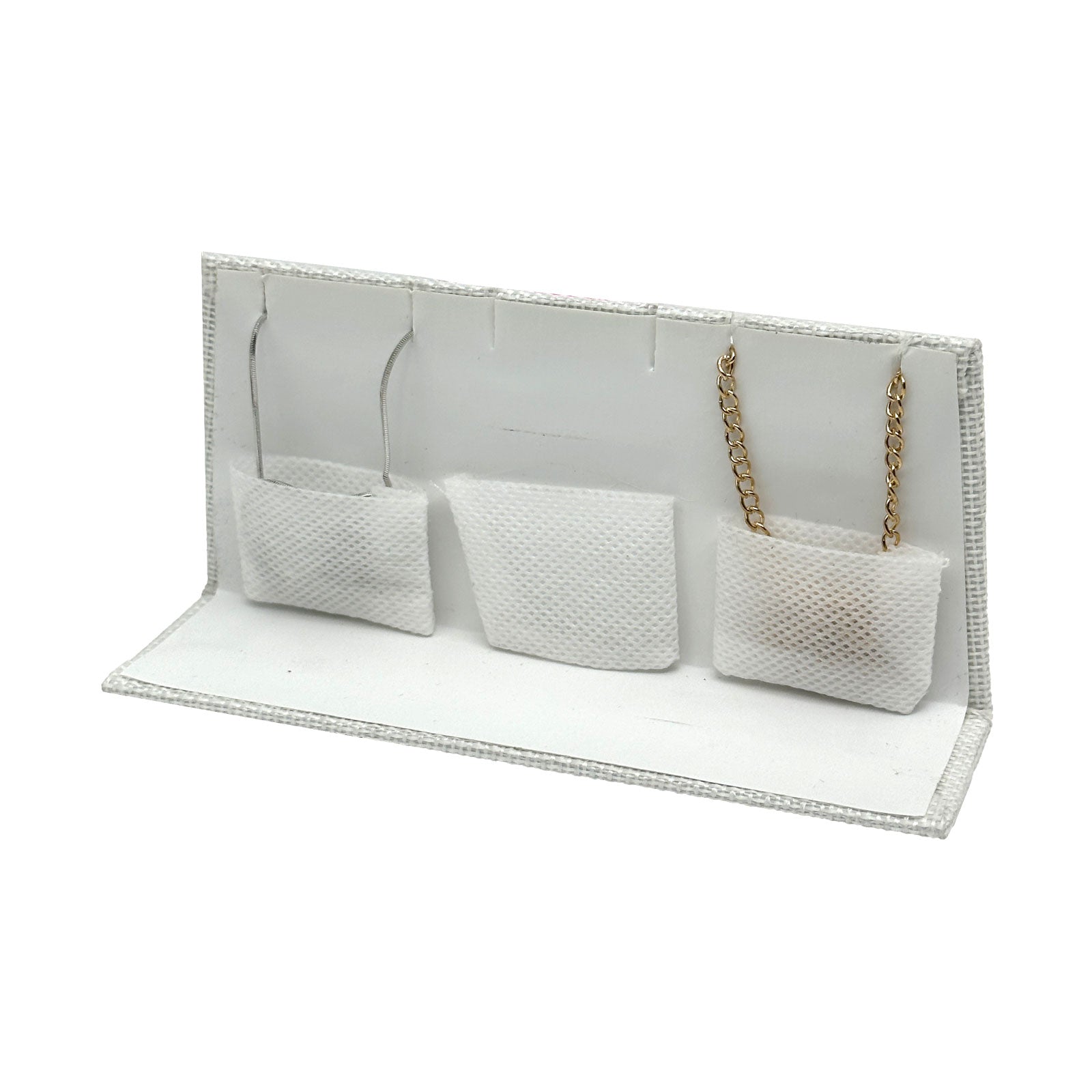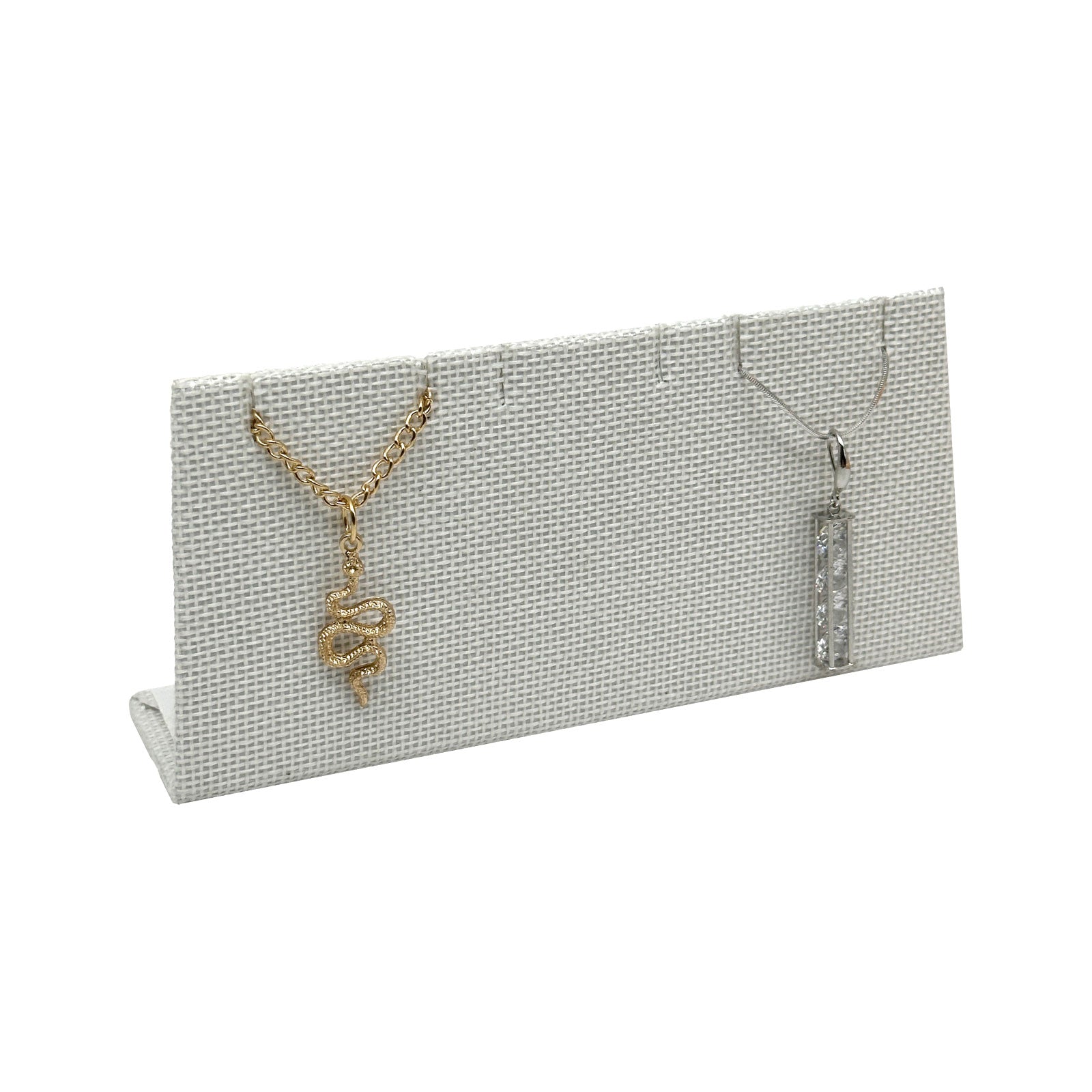 - Display your beautiful jewelry with this white linen earring and necklace easel display.
