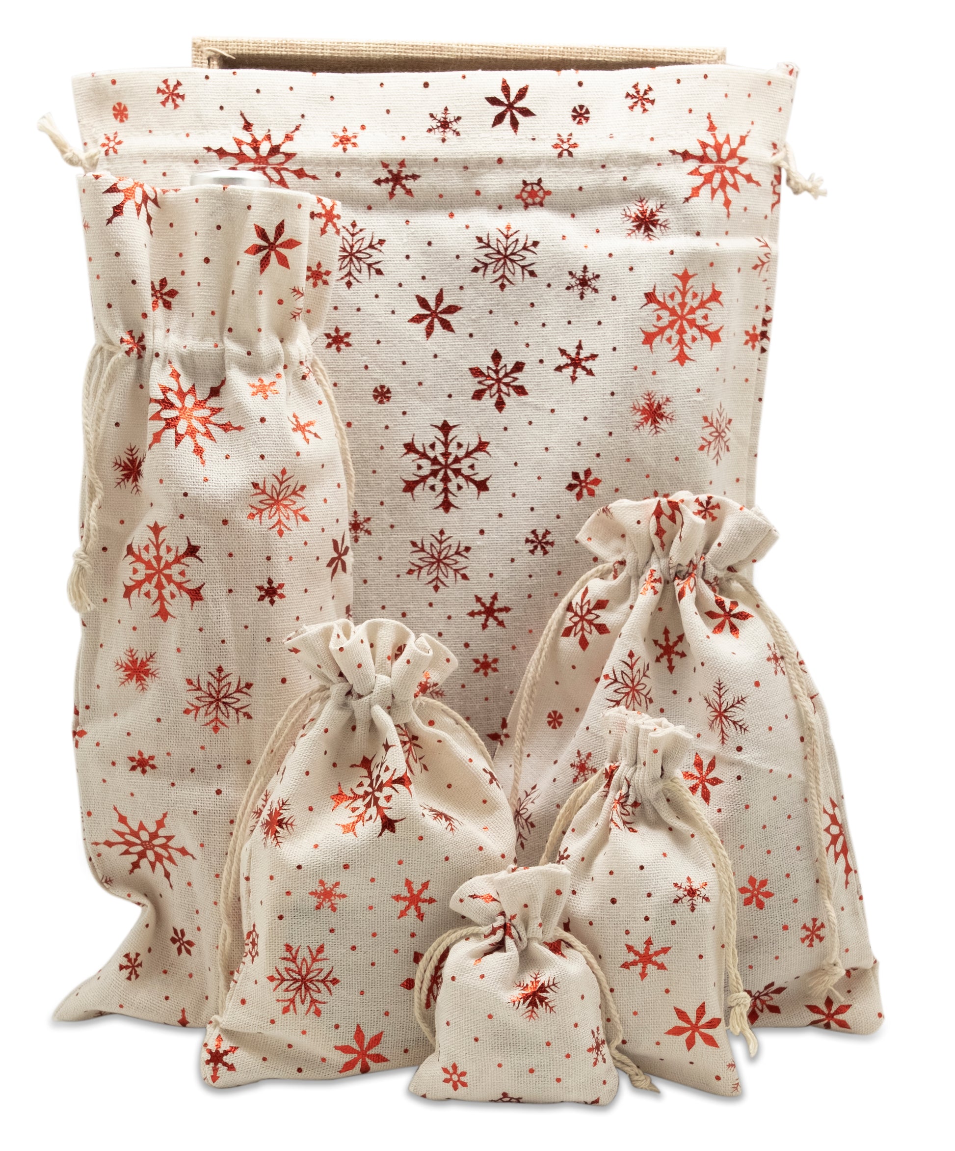 K P. 8" x 10" Cotton Muslin Red Snowflake Drawstring Gift Bags