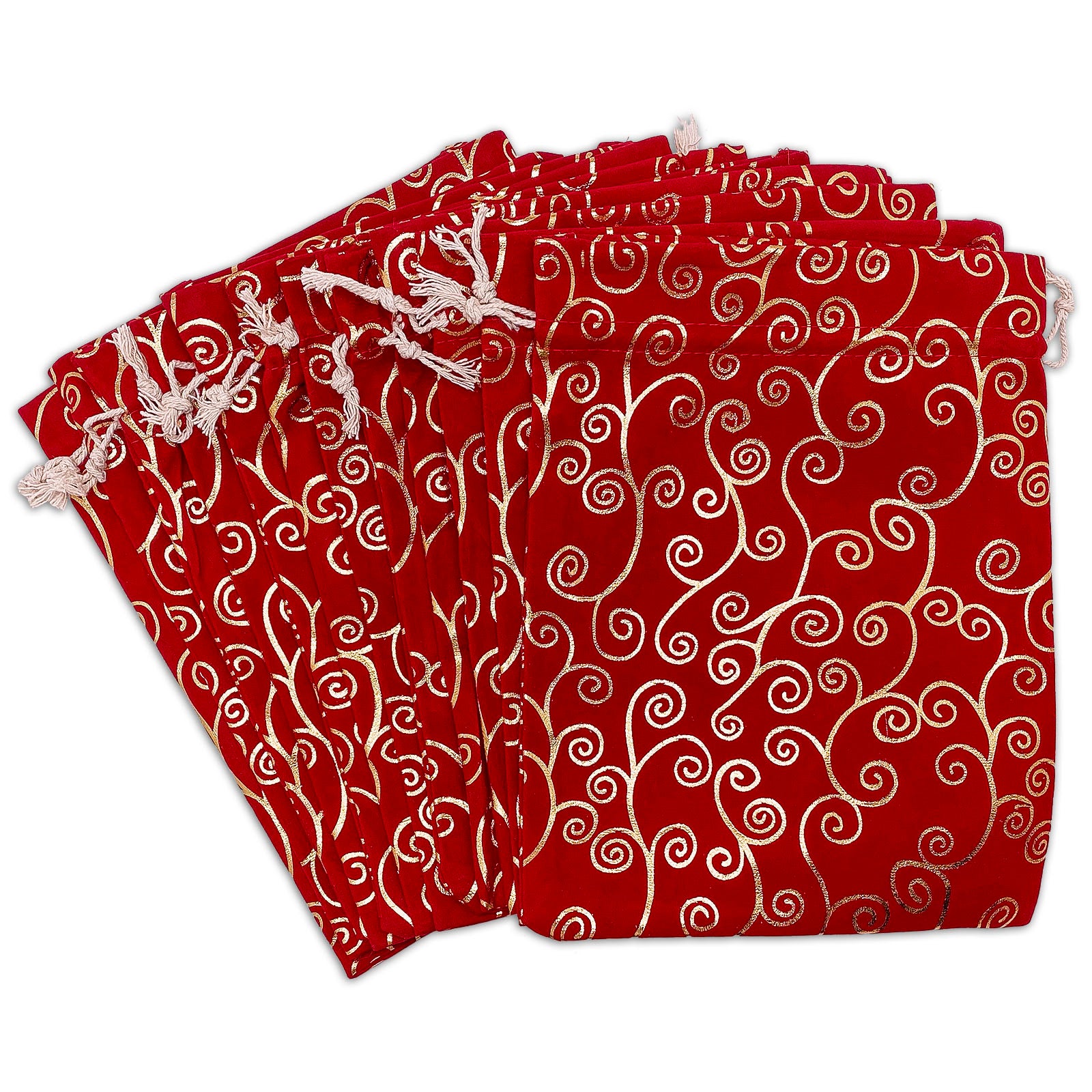 8" x 10" Red Velvet Gold Swirl Christmas Drawstring Gift Bags