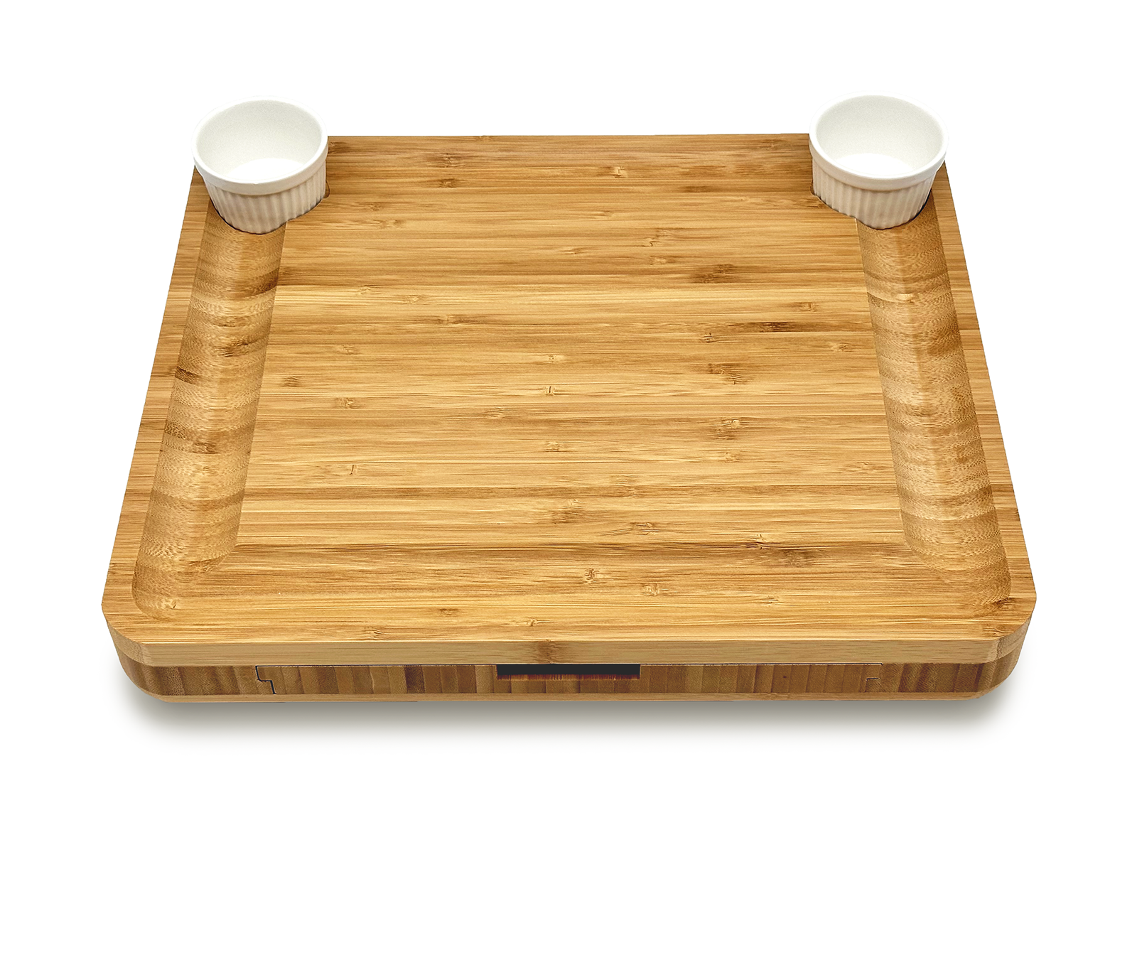 - Our bamboo charcuterie board is made of solid, natural bamboo that is spacious enough for any kind of serving. A set of stainless steel cheese knives give you the right tools to impress your guests. Included white ceramic bowls for sauces or smaller snacks help keep the board organized while adding a luxurious flair.