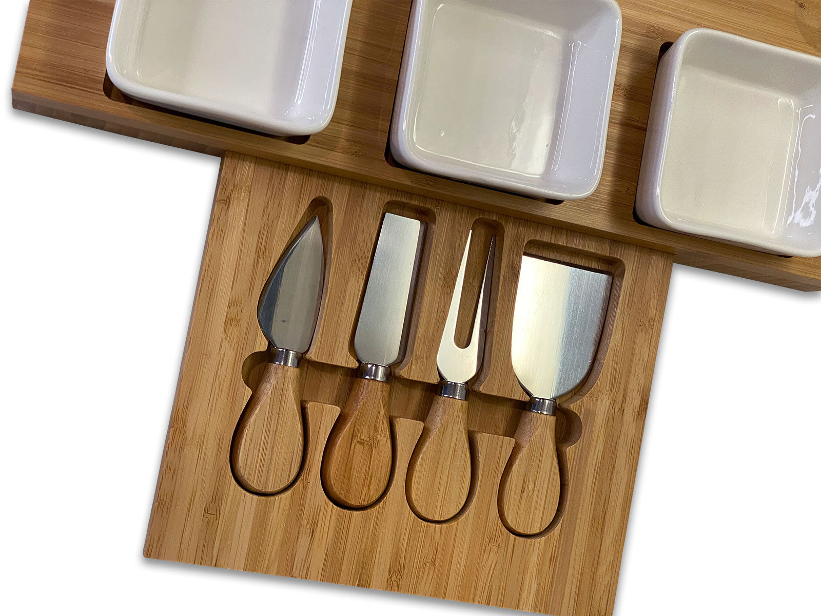 - Our bamboo charcuterie board is made of solid, natural bamboo that is spacious enough for any kind of serving. A set of stainless steel cheese knives give you the right tools to impress your guests. Included white ceramic plates for sauces or smaller snacks help keep the board organized while adding a luxurious flair.