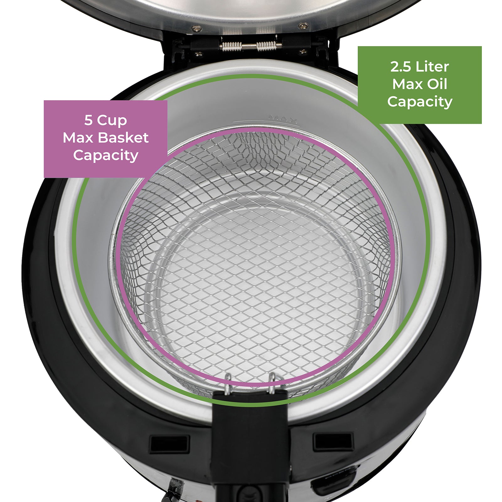 - Powerful & Efficient Performance: Equipped with a 1200W heating element for rapid heat-up and consistent temperature, the deep fryer quickly heats its 2.5-quart oil capacity, allowing you to fry up to 7 cups of food with perfect crisp results.
