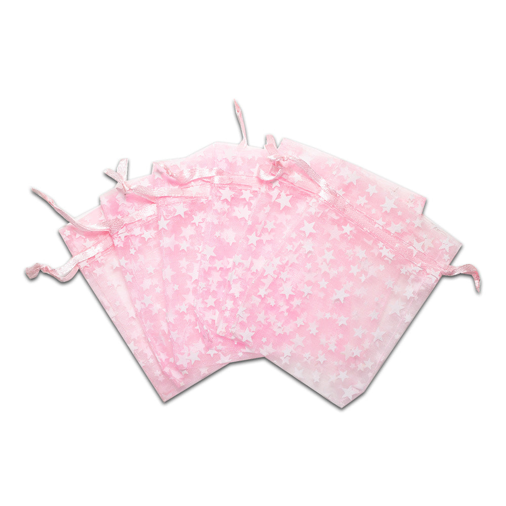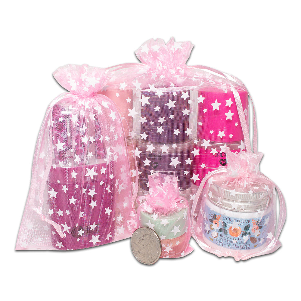 Pink with White Star Organza Drawstring Pouch Gift Bags