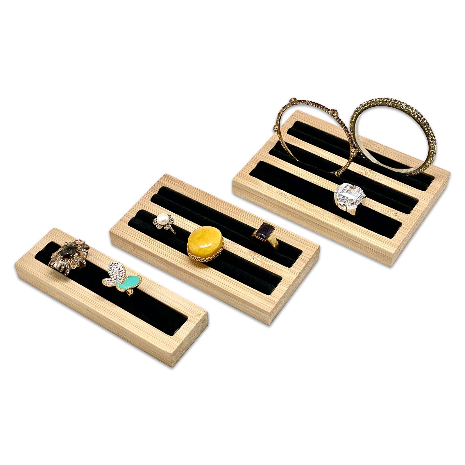 - A three-row ring tray perfect for storing and displaying a wide variety of products from earrings to rings and more.